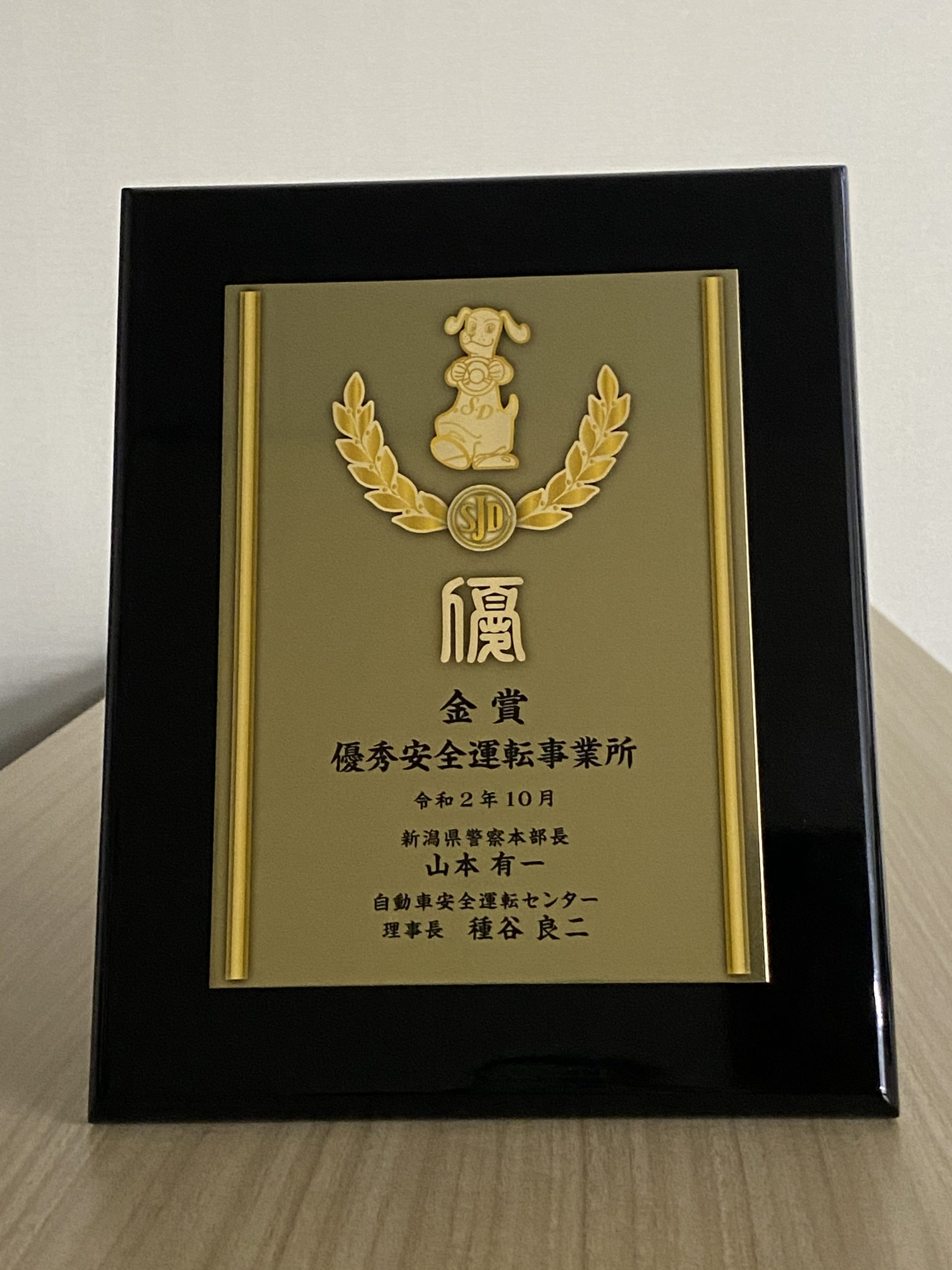 優秀安全運転事業所として表彰を受けました 2020年11月12日 株式会社テクノジェットのホームページをご覧いただき、ありがとうございます。 この度、新潟南警察署長様と自動車安全運転センター理事長様より、「優秀安全運転事業所」として金賞を受賞いたしました。 全従業員が日頃より安全運転を意識してくれたおかげで、無事故無違反を達成し表彰をいただく事ができました。 この表彰を糧に、これまで以上に安全運転に努めていきたいと思います。