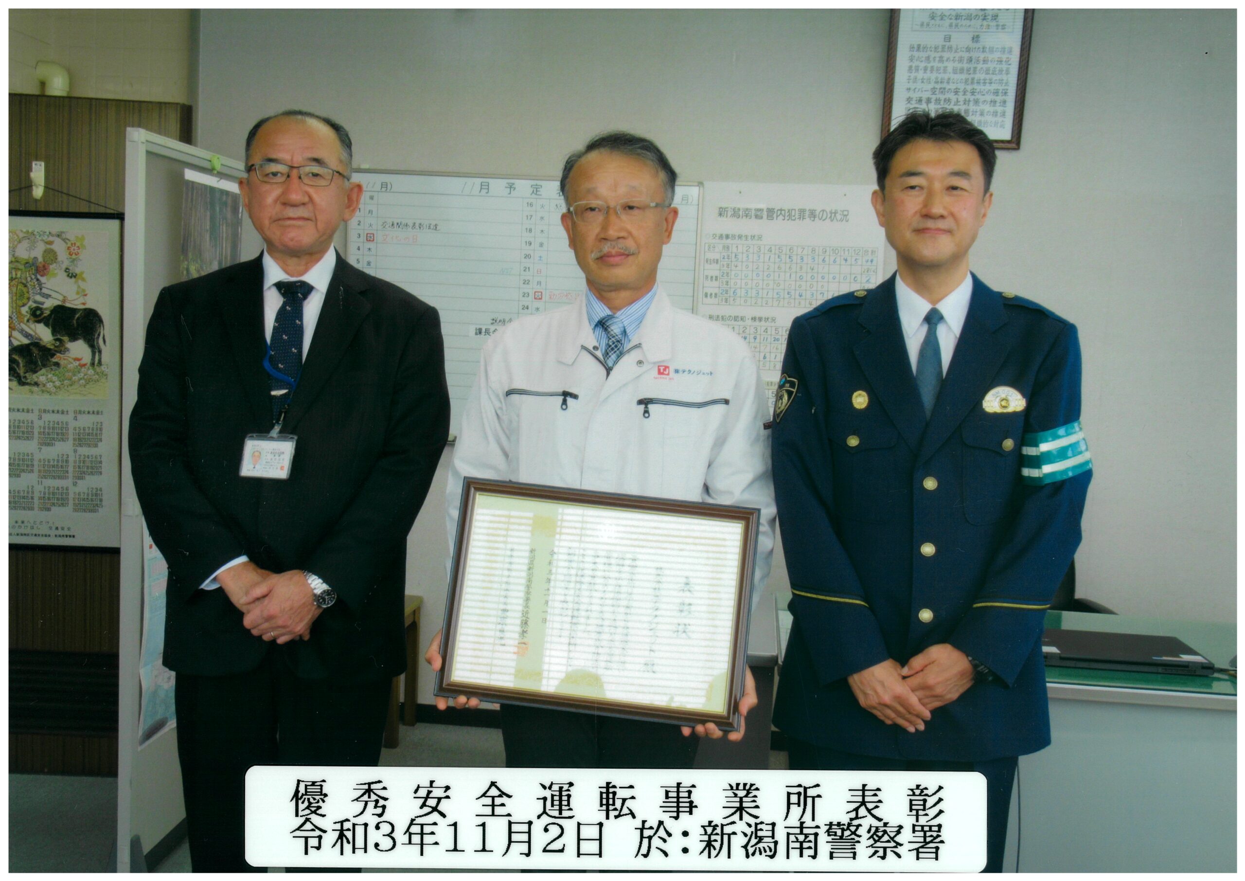 優秀安全運転事業所として表彰を受けました 2021年11月18日 株式会社テクノジェットのホームページをご覧いただき、ありがとうございます。 この度、新潟南警察署長様と自動車安全運転センター理事長様より、「優秀安全運転事業所」として銅賞を受賞いたしました。 昨年、同じ時期に金賞をいただきまして、今年も銅賞をいただくことができました。 これもひとえに、社員一人一人が日頃から安全運転を心がけてくれているおかげだと思います。 これからも思いやり運転を心がけて、無事故無違反を達成していけたらと思います。