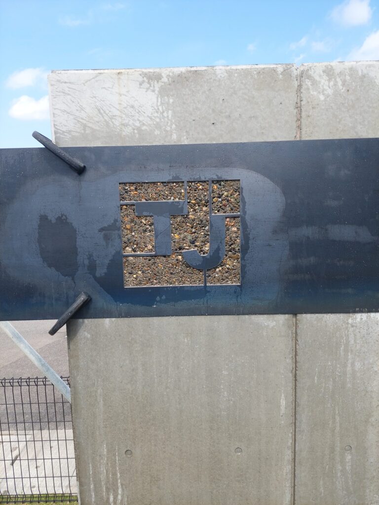 擁壁に会社名をくりぬいた鉄板を設置し、